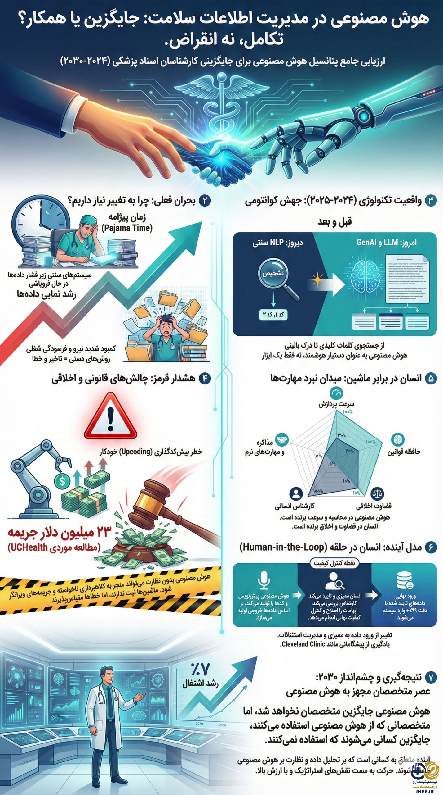 این گزارش تحقیقاتی جامع، با حجمی بالغ بر ۱۵,۰۰۰ کلمه، به بررسی یکی از بحثبرانگیزترین موضوعات در تقاطع فناوری و بهداشت میپردازد: آیا هوش مصنوعی (AI) ظرفیت جایگزینی کامل کارشناسان رسیدگی به اسناد پزشکی و کدگذاران بالینی را دارد؟ با تحلیل دقیق دادههای جمعآوری شده از منابع معتبر دولتی، گزارشهای صنعتی، و مطالعات آکادمیک در سالهای ۲۰۲۴ و ۲۰۲۵، این سند استدلال میکند که اگرچه هوش مصنوعی پارادایمهای عملیاتی را از اساس تغییر داده است، اما جایگزینی کامل نیروی انسانی به دلایل فنی، حقوقی و اخلاقی در افق کوتاهمدت تا میانمدت (تا سال ۲۰۳۰) غیرمحتمل است.