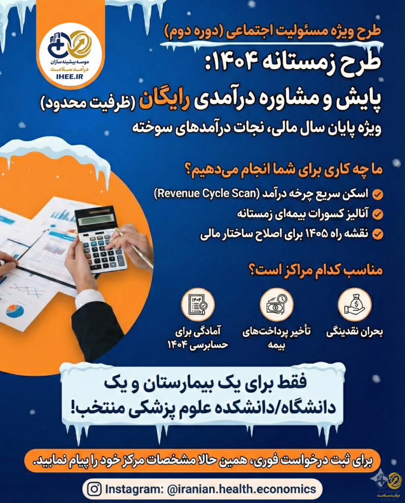 پس از استقبال بینظیر از فاز اول طرح مسئولیت اجتماعی «بیشینهسازان درآمد سلامت» و درخواستهای مکرر، مفتخریم که فاز دوم طرح پایش و مشاوره رایگان را ویژه زمستان ۱۴۰۴ آغاز کنیم. این طرح فرصتی طلایی برای مدیرانی است که میخواهند سال مالی خود را با تراز مثبت و کمترین تنش مالی به پایان برسانند.