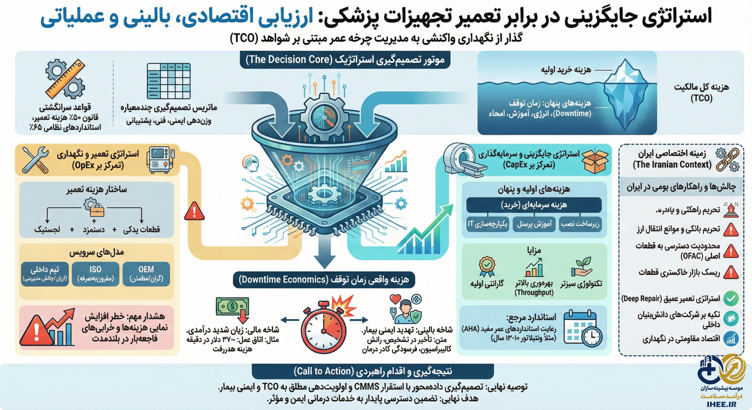 تصمیمگیری بین خرید تجهیزات جدید و تعمیر تجهیزات قدیمی، یک نقطه تلاقی بین اقتصاد، مهندسی و اخلاق پزشکی است. تحلیلهای ارائه شده در این گزارش نشان میدهد که رویکرد تکبعدی (صرفاً مالی یا صرفاً فنی) محکوم به شکست است.