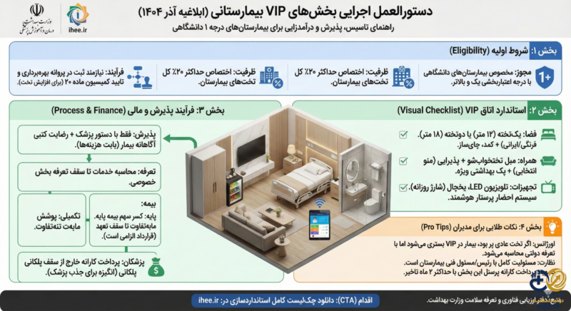 دانلود دستورالعمل اجرایی بخش/تخت های با خدمات رفاهی ویژه (VIP)بیشینه سازان درآمد سلامت۱۴۰۴/۰۹/۲۸وزارت بهداشت، درمان و آموزش پزشکی معاونت درمان – دفتر ارزیابی فناوری، تدوین استاندارد و ... ادامه مطلب